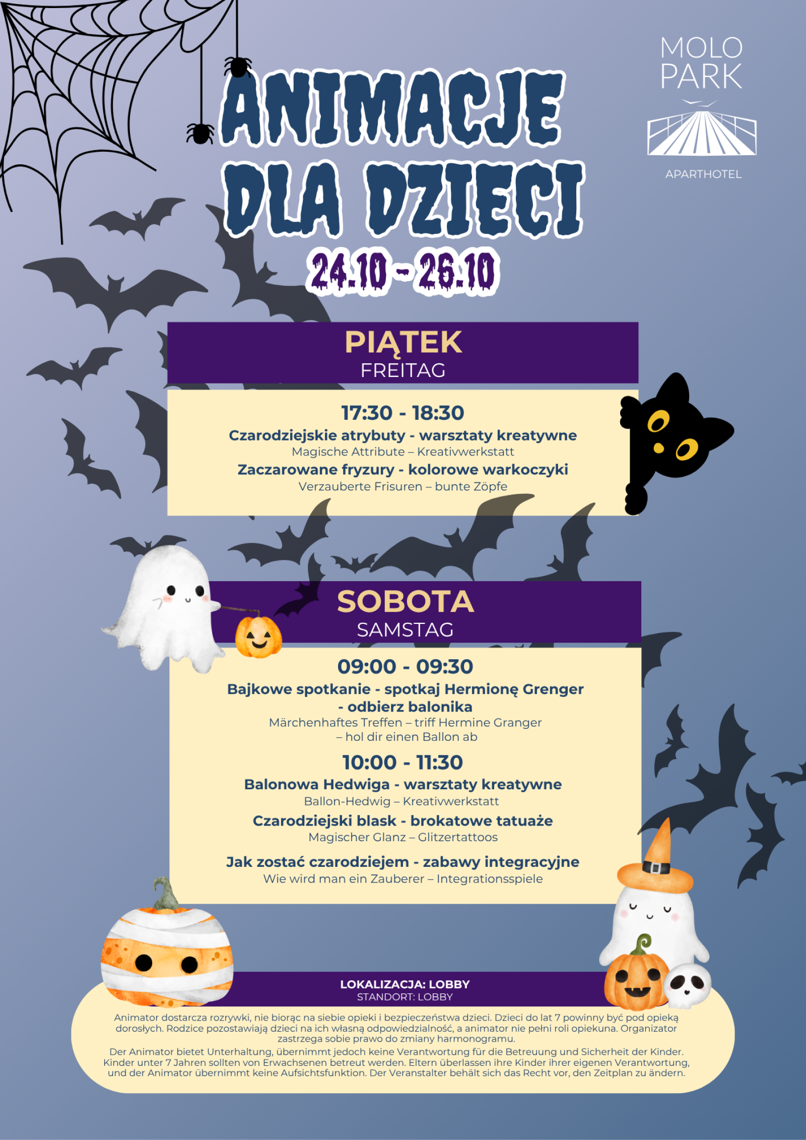 - Animator dostarcza rozrywki, nie biorąc na siebie opieki i bezpieczeństwa dzieci. Dzieci do lat 7 powinny być pod opieką dorosłych. Rodzice pozostawiają dzieci na ich własną odpowiedzialność, a animator nie pełni roli opiekuna. Organizator zastrzega sobie prawo do zmiany harmonogramu.