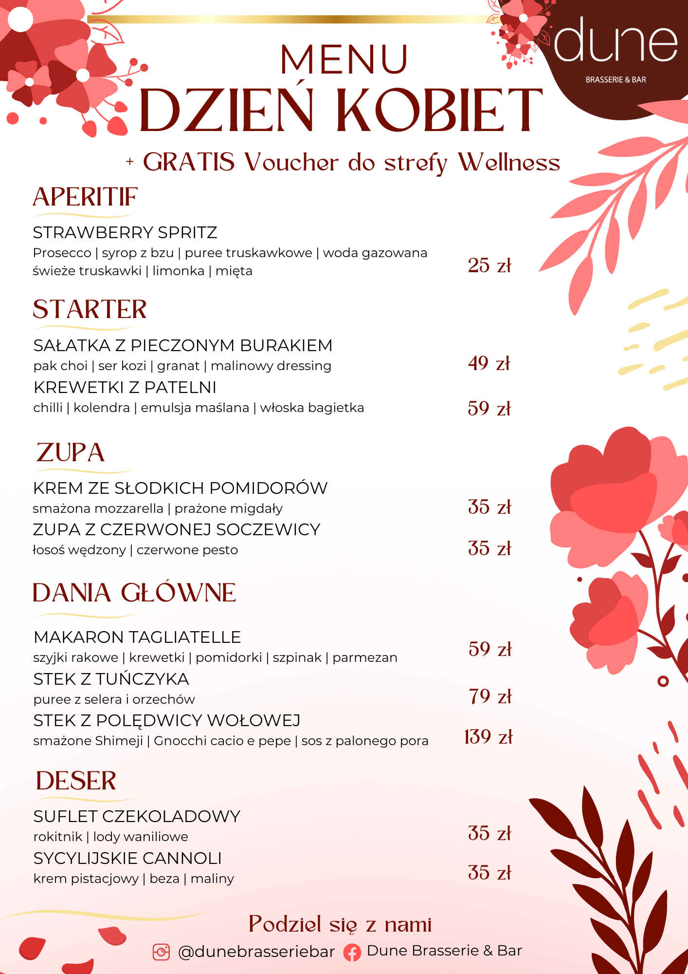 Już niedługo odbędzie wyjątkowy dzień, czyli Dzień Kobiet 7 | 8 | 9 marca w restauracji Dune Brasserie & Bar. W tematycznym menu m.in. kobiecy drink strawberry spritz, pyszne krewetki z patelni, zupę z czerwonej soczewicy, stek z tuńczyka czy słodkie sycylijskie cannoli.