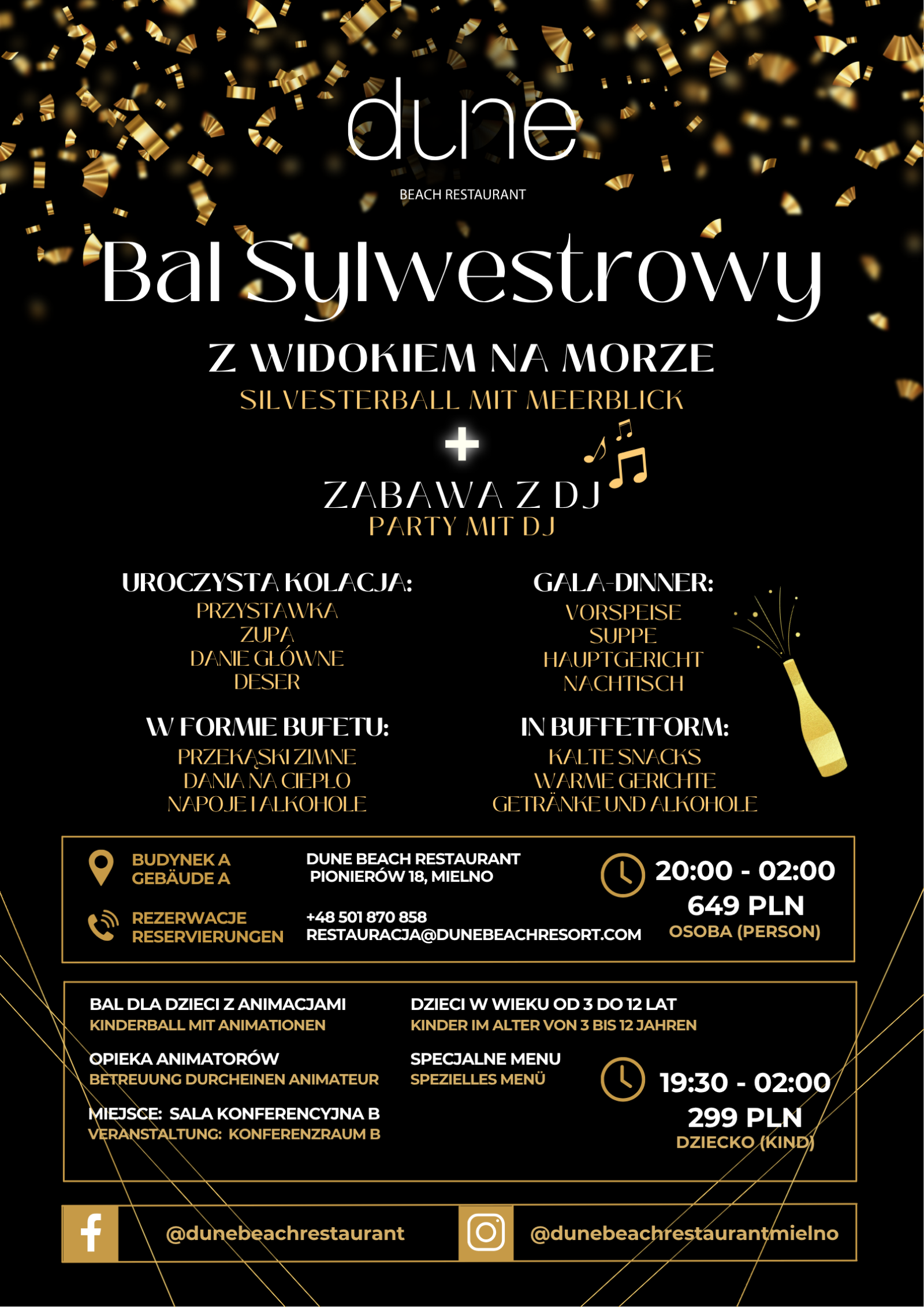 BAL SYLWESTROWY 2025/2026 z widokiem na morze  w naszym partnerskim obiekcie Dune Beach Resort!                                                                            /   SILVESTERBALL 2025/2026 mit Meerblick in unserem Partnerresort Dune Beach Resort
