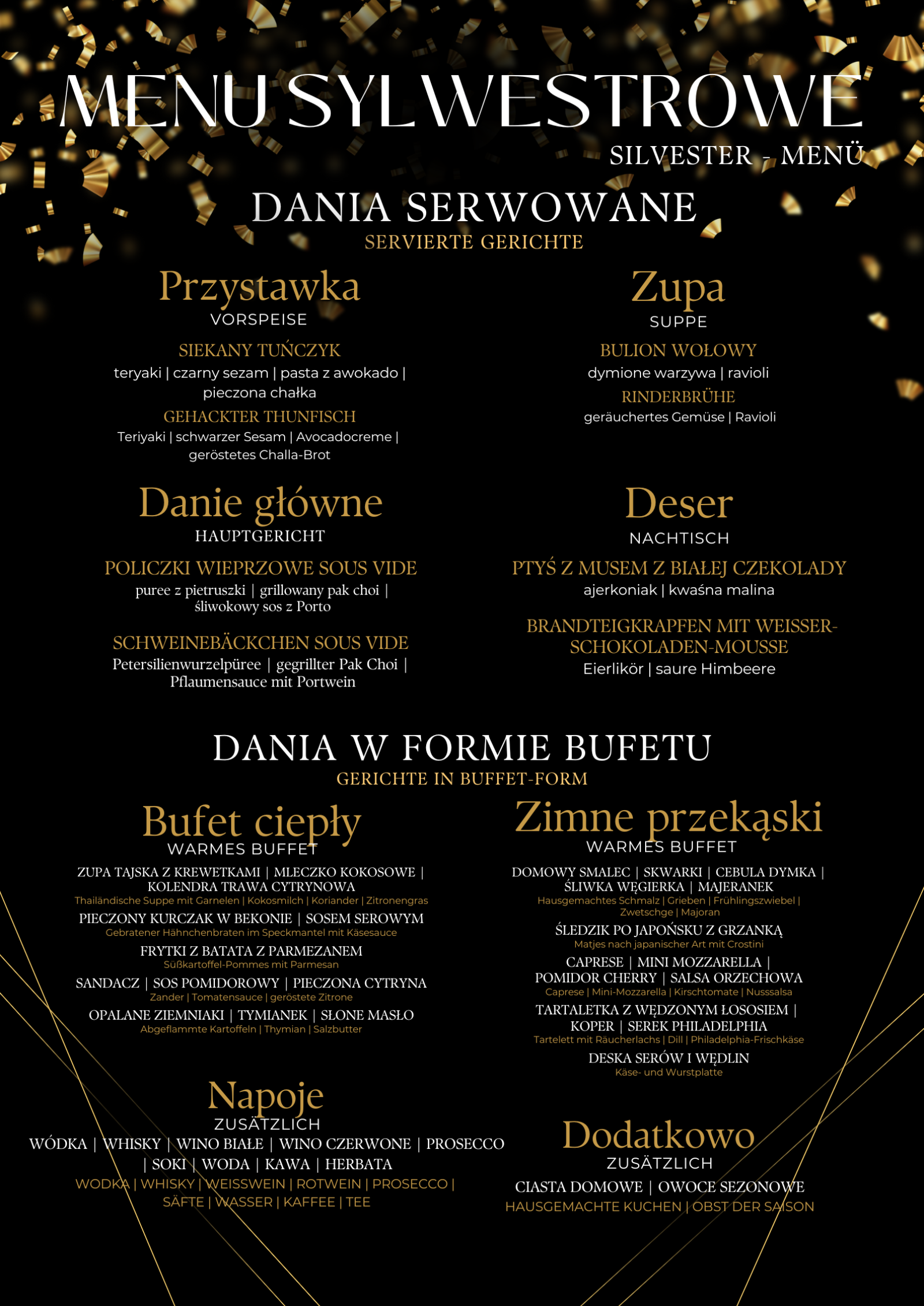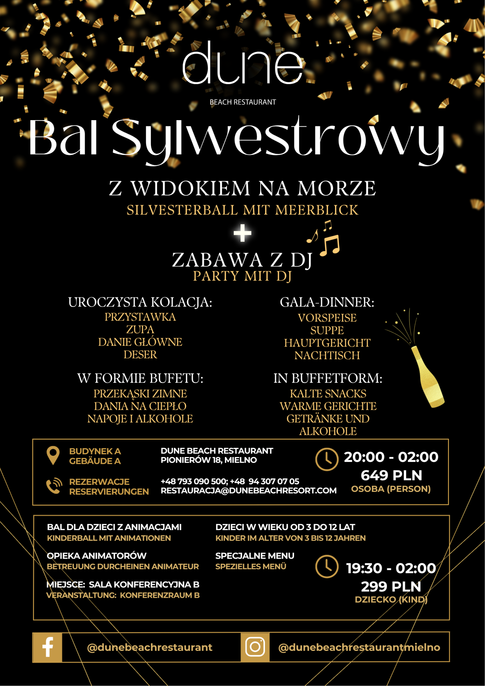 - Bal Sylwestrowy dla dorosłych (20:00–2:00) to wyjątkowa zabawa przy muzyce DJ-a. Wieczór rozpocznie się uroczystą kolacją, w której skład wchodzą: przystawka, zupa, danie główne oraz deser. Dodatkowo, do dyspozycji Gości będzie bufet z alkoholem, napojami, przekąskami zimnymi oraz ciepłymi daniami. O północy wspólnie powitamy Nowy Rok, wznosząc toast. Koszt - 649 PLN za osobę dorosłą.