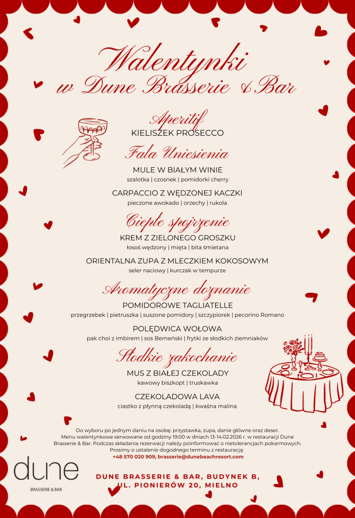 Z okazji nadchodzących Walentynek zapraszamy na romantyczną kolację w blasku świec. Zarezerwujcie stolik w eleganckiej restauracji Dune Brasserie & Bar (znajdującej się około 900m od Molo Parku) i otrzymajcie voucher na strefę Wellness GRATIS!