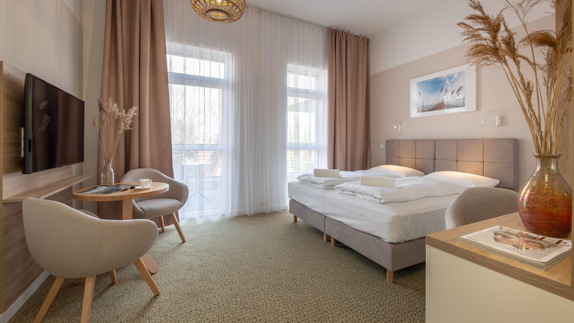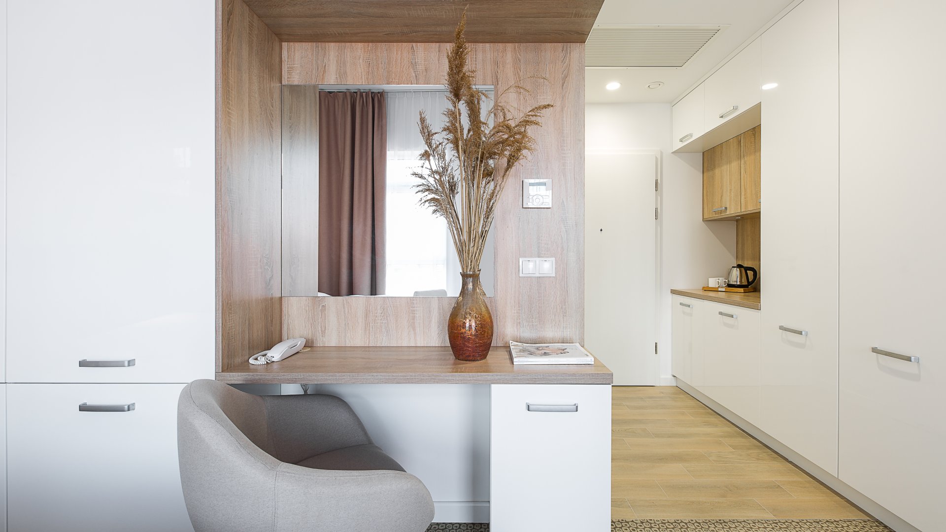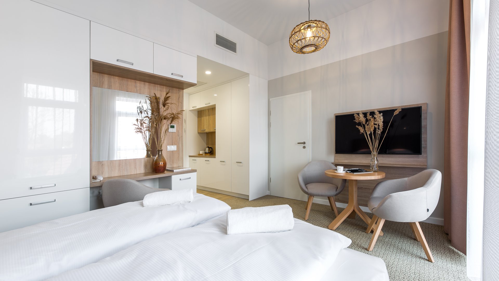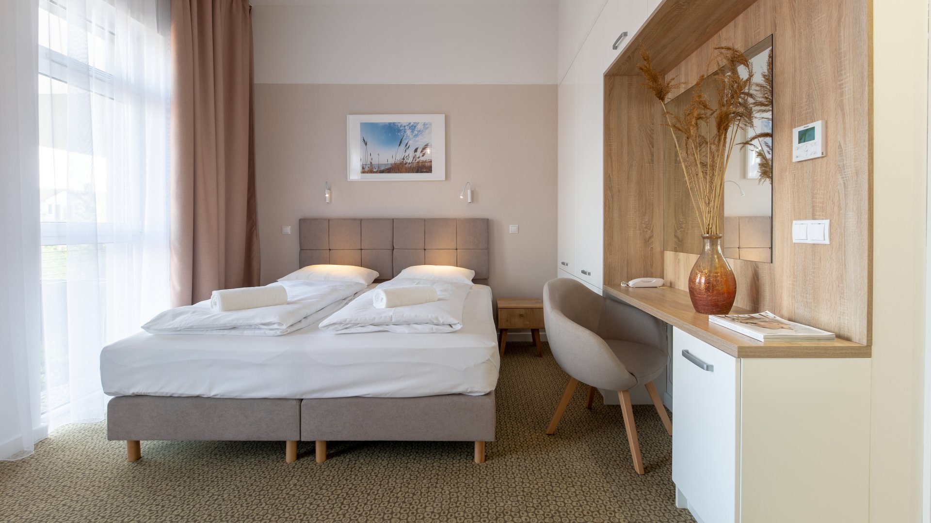 Comfortable apartment for those seeking their own place by the sea, as well as an attractive investment in the MOLO PARK investment. The 49 m2 space is designed as two hotel rooms, each with its own bathroom. They can be used completely independently, or connected when more space is needed. The apartment is fully furnished and arranged. Cozy interior colours, pleasant materials, comfortably arranged bathroom with shower. Independent exits to two terraces from the apartment. There is a possibility to entrust the apartment to management and generate additional rental income when we are not able to use it ourselves. Investing in a Molo Park apartment is a safe way to invest capital and increase your wealth for the future. It is a completely maintenance-free investment if we decide to cooperate with the operator. This does not limit our ability to use the apartment according to our private needs. At our disposal is a 24-hour reception with security, a Wellness zone with a quiet swimming pool and a sauna. On the roof there is a public sun terrace with sunbeds, from which there is a beautiful view of the surface of Lake Jamno and the panorama of Mielno. Breakfasts and dinners in the form of a buffet are served daily.